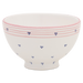 Fayence weiss mit blauen Punkten und rosa Rand Glasur glänzend