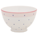Fayence weiss mit blauen Punkten und rosa Rand Glasur glänzend