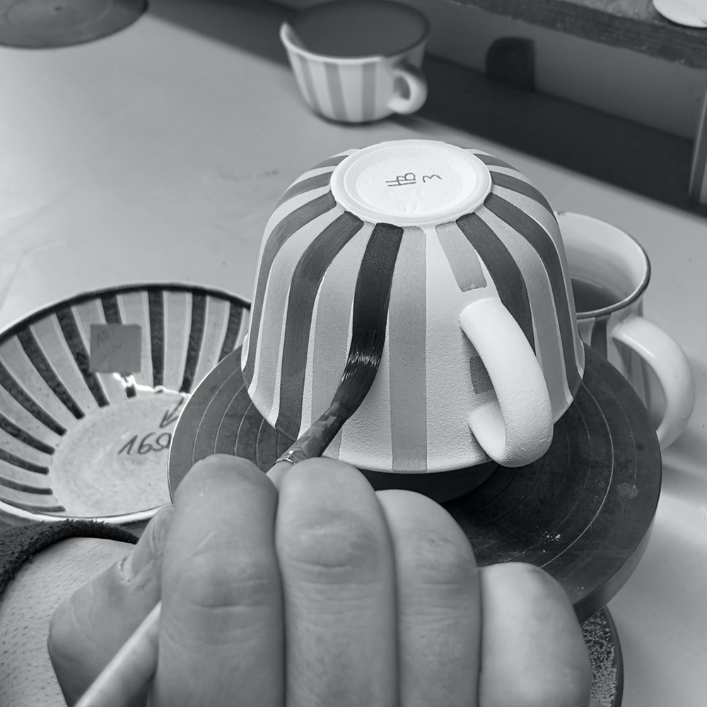 Die Milchkaffeetasse von Hedwig Bollhagen mit der Formnummer „490“ besticht durch ihre einfache und schnörkellose Form. Mit einem Fassungsvermögen von 0,3 Litern ist die sieben Zentimeter hohe und zwölf Zentimeter breite Milchkaffeetasse weder zu klein noch zu groß. Charakteristisch für das zweiteilige Set aus Tasse und Untertasse ist der halbrund geschwungene Henkel. Und sollte beim Servieren doch mal ein kleines Malheur passieren und der Milchkaffee über den filigranen Rand der Tasse schwappen, dann fängt die nach oben leicht gebogene Untertasse mit Sicherheit alles auf. Eins ist sicher, ob Kaffee mit viel heißer Milch oder Milchschaum, in der Milchkaffeetasse von Hedwig Bollhagen lassen sich Heißgetränke aller Art trinkgerecht servieren.