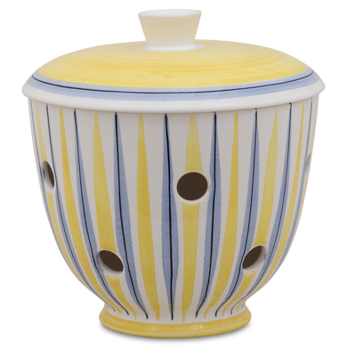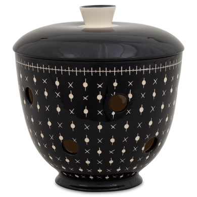Der Zwiebeltopf mit der Formnummer “549DS” von Hedwig Bollhagen präsentiert die Schalotten auf dem Küchenregal zeitlos und stilsicher. Das zweiteilige Set aus Gefäß und Deckel bietet bei einer Höhe von 14 Zentimetern ausreichend Platz für rote, weiße oder gelbe Zwiebeln. Charakteristisch ist der kugelförmig-gebauchte, nach oben konisch zulaufendem Korpus. Der kegelförmige Griff auf dem bauchig nach oben gewölbten Deckel rundet das Design harmonisch ab. Dank der zahlreichen, gleichmäßig verteilten und je etwa einen Zentimeter großen Luftlöcher werden Feuchtigkeit und Staunässe vermieden. Sicher ist, im dunklen Inneren des Zwiebeltopfes 549DS von Hedwig Bollhagen bleibt das gesunde Lauchgewächs lange frisch und sieht dabei richtig gut aus.