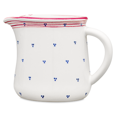 Fayence weiss mit blauen Punkten und rosa Rand Glasur glänzend