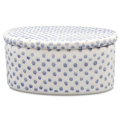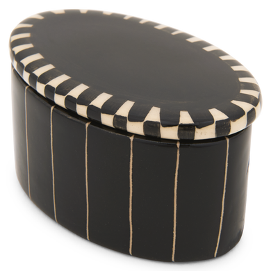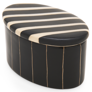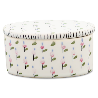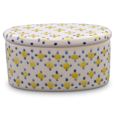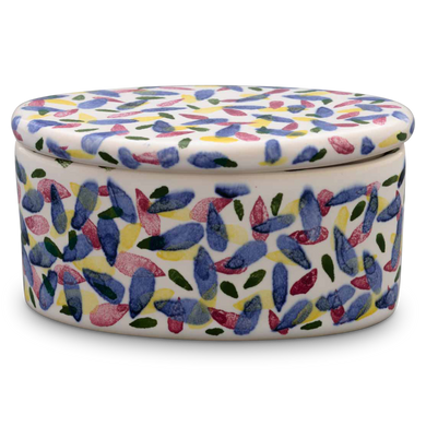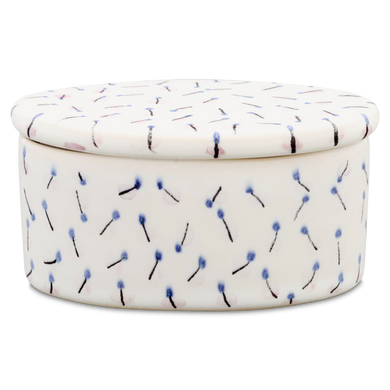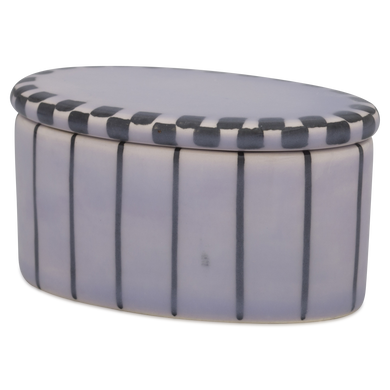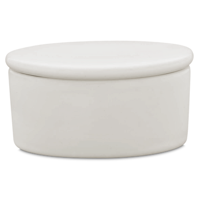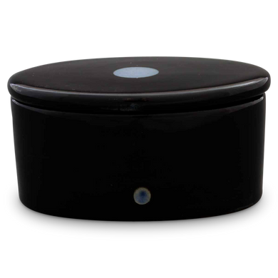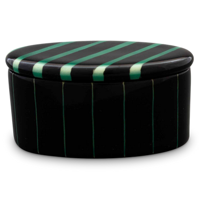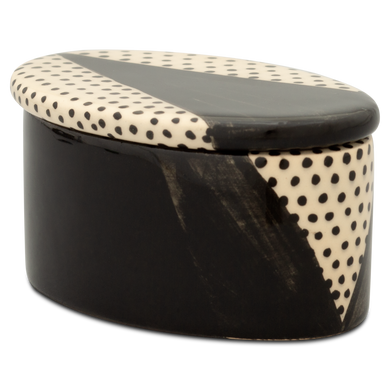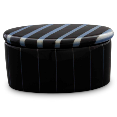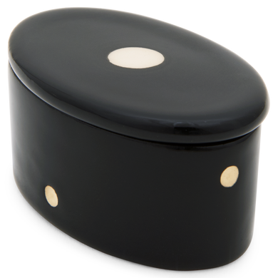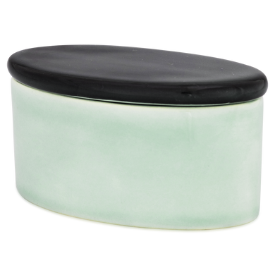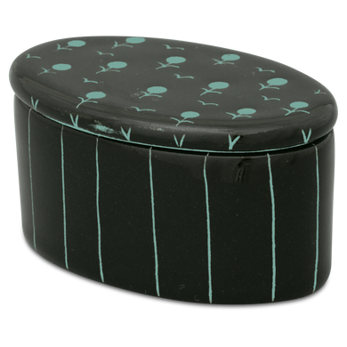 Die Dose von Hedwig Bollhagen mit der Formnummer „874“ müsste man wohl eher als Kleinstdöschen bezeichnen. Charakteristisch für das zweiteilige Set aus Gefäß und Verschluss sind der ovale Korpus und der ebenso ovale, flache Deckel. Fünf Zentimeter lang, siebeneinhalb Zentimeter breit, vier Zentimeter hoch – mit ihren Maßen zählt das 90 Gramm leichte Döschen mit einem Fassungsvermögen von nur 0,04 Litern wohl zu den kleinsten in der keramischen Kollektion von Hedwig Bollhagen. So viel steht fest, ob Tabletten, Pillen oder Globuli, diese zierliche Dose ist der perfekte Aufbewahrungsort für die alltäglichen Arzneien und Medikamente aller Art.