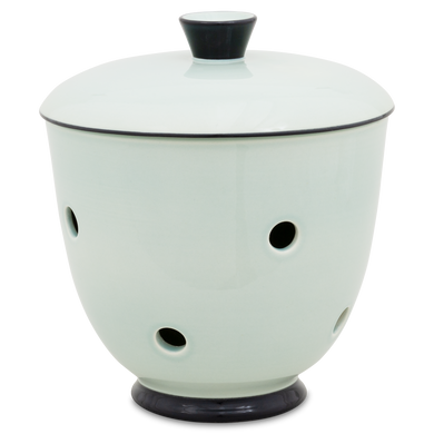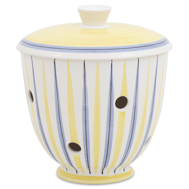 Der Zwiebeltopf mit der Formnummer “549ES” von Hedwig Bollhagen ist die große Schwester der kleineren Version 549DS. Bei einer Höhe von 18 Zentimetern und einer Breite von 19,5 Zentimetern ist der Zwiebeltopf 549ES fast so hoch wie breit. Charakteristisch ist der kugelförmig-gebauchte, nach oben sich konisch öffnende Korpus. Der kegelförmige Griff auf dem bauchig nach oben gewölbten Deckel rundet das Design elegant ab. Dank der zahlreichen, verteilten und je etwa einen Zentimeter großen Löcher in der Gefäßwand kann die Luft gut zirkulieren. Das zweiteilige Set aus Gefäß und Deckel bietet Schalotten, Zwiebeln und Knoblauch nicht nur einen nachhaltigen und stilsicheren Aufbewahrungsort sondern im dunklen Inneren bleibt das Lauchgewächs auch lange frisch und schmackhaft.