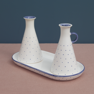 Fayence weiß mit blauen Punkten und Abschluß Glasur glänzend