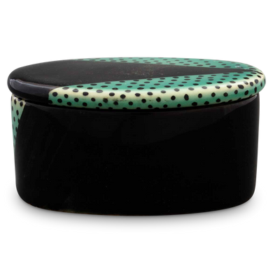 grün mit schwarzen Punkten und schwarzem Keil