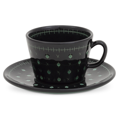 Die Kaffeetasse von Hedwig Bollhagen mit der Formnummer „588“ überzeugt durch ihre schlichte und klare Form. Mit einem Fassungsvermögen von nur 0,1 Liter gehört die 270 Gramm leichte, sechs Zentimeter niedrige und zehn Zentimeter breite Kaffeetasse wohl zu den etwas kleineren ihrer Sorte. Charakteristisch für das zweiteilige Set sind der konische Korpus der Tasse und der leicht nach oben gebogene Rand der Untertasse. Nach unten findet das Gefäß in der kreisrunden Öffnung der Untertasse einen festen Halt. Und sollte beim Servieren doch mal ein kleines Missgeschick geschehen und etwas vom Kaffee über den Gefäßrand schwappen, dann tropft das Heißgetränk wenigstens nicht auf den Tisch. So viel steht fest, mit der Kaffeetasse von Hedwig Bollhagen lässt sich das tägliche Kaffeeritual formvollendet zelebrieren.