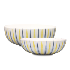 Fayence weiß gelbe Bänder und blaue Striche Glasur glänzend