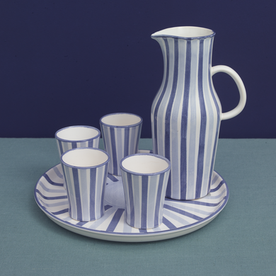 Das sechsteilige Krug-Becher-Set HB 580 vereint schlichte Eleganz mit handwerklicher Perfektion und ist die ideale Wahl für stilvolles Servieren. Der Krug HB 580 beeindruckt mit seiner schlanken, harmonisch gebauchten Form, einem sanft geschwungenen Henkel und einem präzisen Ausguss. Mit einem Fassungsvermögen von 0,8 Litern eignet er sich perfekt für Wasser, Säfte oder hausgemachte Limonaden. Ergänzt wird er durch vier Becher HB 560, die mit ihrer klaren, leicht konischen Form und einem Volumen von 0,13 Litern ideal für kleine Erfrischungen sind. Die vielseitige Platte HB 560 komplettiert das Set – als Serviertablett für den Krug und die Becher oder als stilvolle Grundlage für kleine Snacks und Gebäck. Seit 1934 werden diese zeitlosen Keramiken in den Hedwig Bollhagen Werkstätten in Marwitz von Hand gefertigt. Kombinieren Sie das Set mit unseren Milchkannen, stilvollen Schüsseln oder passenden Tellern um Ihre Tischkultur perfekt abzurunden. Entdecken Sie unser gesamtes Sortiment an handgefertigtem Geschirr und bringen Sie traditionelle Handwerkskunst in Ihr Zuhause.