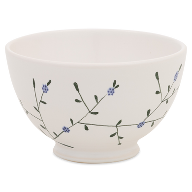 Fayence weiß blaue Blüten an grünem Stiel Glasur glänzend