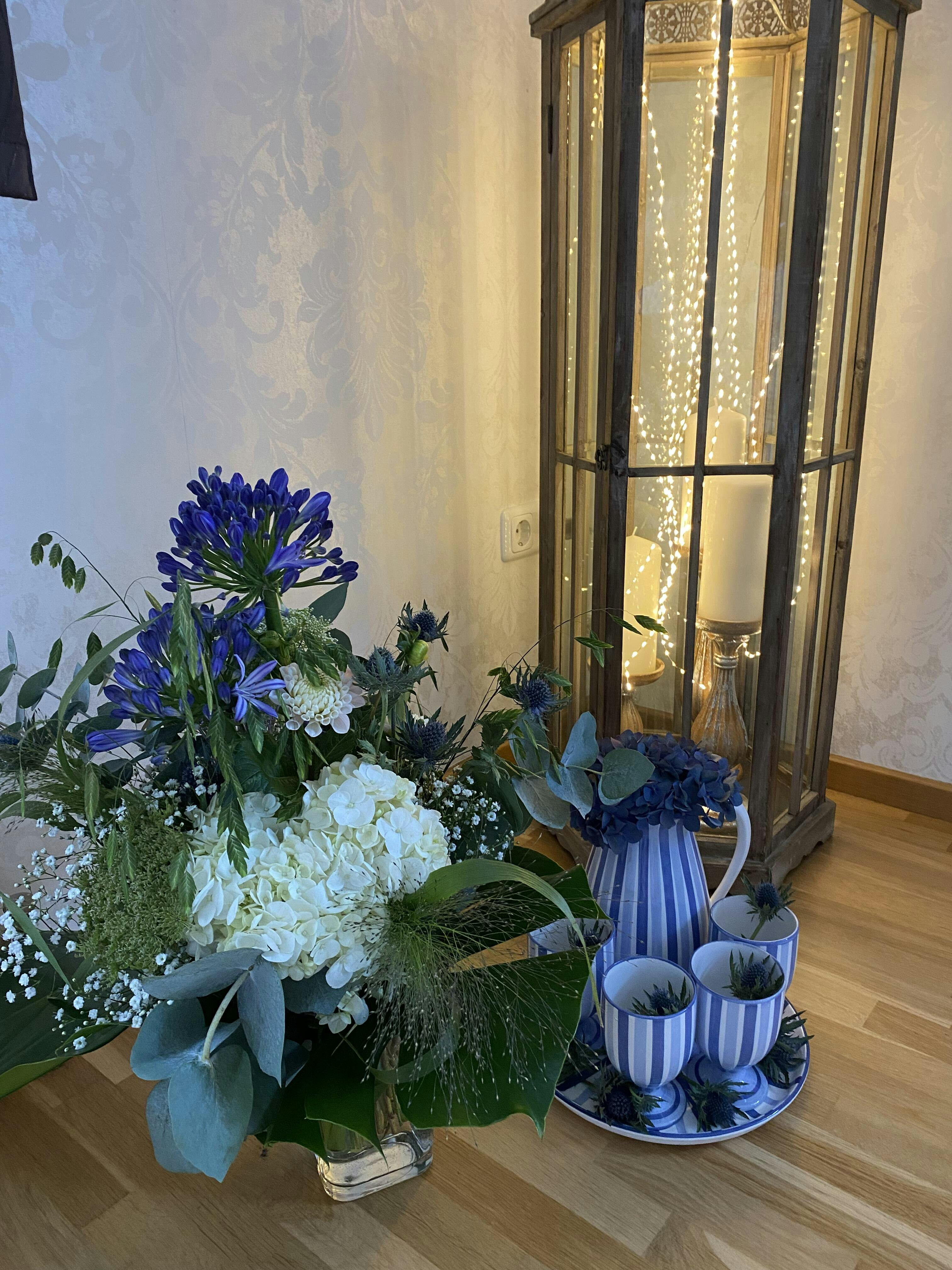 Fayence weiß - blaue und hellblaue Streifen - Glasur glänzend