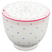 Fayence weiss mit blauen Punkten und rosa Rand Glasur glänzend