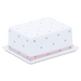 Fayence weiss mit blauen Punkten und rosa Rand Glasur glänzend