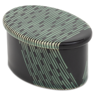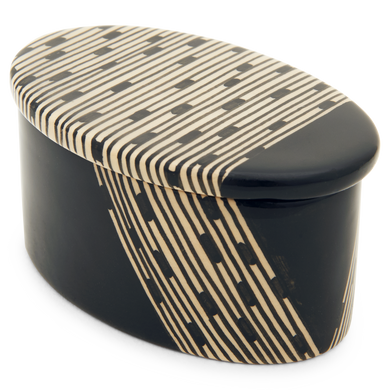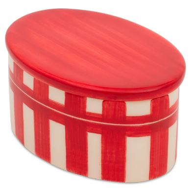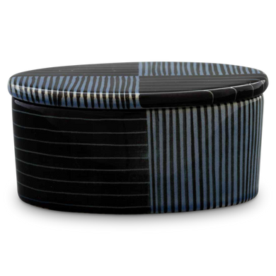 Die Dose von Hedwig Bollhagen mit der Formnummer „484“ besticht durch ihr zeitlos ansprechendes Design mit nostalgischer Note und ihren multifunktionalen Charakter. Typisch für das zweiteilige Set, bestehend aus Keramikgefäß und Verschluss, sind der oval geschwungene, geradlinig wachsende Korpus und der flache Deckel in harmonisch fließender Konturenzeichnung. Mit einer Höhe und Breite von 5 Zentimetern und einer Länge von 9,5 Zentimetern bietet sich die hübsche Keramikdose zum Aufbewahren diverser Köstlichkeiten und Schätze an. Die 100 ml fassende und nur 150 Gramm leichte Dose 484 ist ein von Hand gemachtes Unikat, das stets stilvolle Akzente im Interieur setzt.