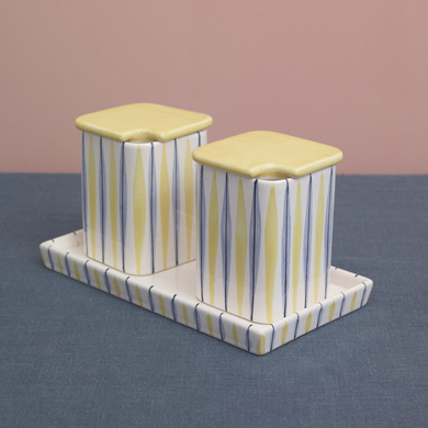 Mit dem 3-teiligen Dosen-Set 872S von Hedwig Bollhagen servieren Sie Marmelade, Honig oder Aufstriche stilvoll und elegant. Die rechteckige Schale 538 bildet die perfekte Basis für die beiden Dosen 872S und sorgt für eine harmonische Anordnung auf dem Frühstückstisch. Mit ihrer klaren, minimalistischen Form kann die Schale auch als kleines Serviertablett für Butter oder Gebäck genutzt werden. Die beiden Dosen 872S mit ihrem quaderförmigen Korpus und dem flachen Deckel fügen sich perfekt in das Ensemble ein. Dank der praktischen Löffelaussparung kann der Marmeladenlöffel stets im Gefäß bleiben, während das kompakte Design es ermöglicht, mehrere Dosen nebeneinander zu arrangieren – ideal, um verschiedene Sorten von Konfitüre oder Honig anzubieten. Seit 1934 entstehen diese hochwertigen Keramiken in den Marwitzer Werkstätten in traditioneller Handarbeit – für höchste Qualität und zeitlose Ästhetik. Ergänzen Sie das Set mit einer passenden Butterdose, einem Milchkännchen, Brottellern und Tassen um Ihre Frühstückstafel stilvoll abzurunden. Ein praktisches und zugleich elegantes Ensemble für Genießer.