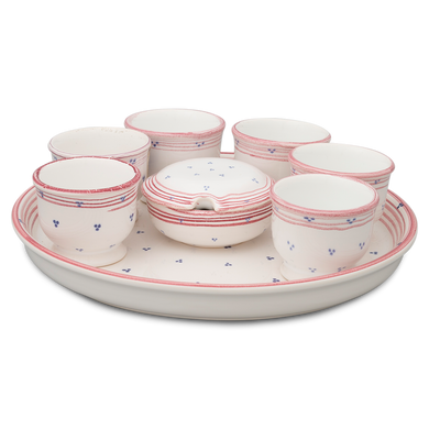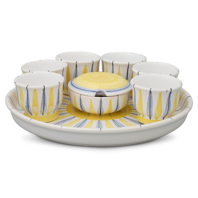 Das 8-teilige Eierbecher-Set von Hedwig Bollhagen bringt Eleganz und Funktionalität auf Ihren Frühstückstisch. Das Herzstück des Sets sind die vier handgefertigten Eierbecher (HB 521), deren bauchige Form und konischer Fuß das Frühstücksei stilvoll präsentieren. Ergänzt werden diese durch eine charmante Dose (HB 521), die sich ideal für Salz, Zucker oder andere Gewürze eignet und durch ihre klassische Gestaltung begeistert. Eine kleine Öffnung im Deckel lässt Platz für einen Löffel. Abgerundet wird das Set durch eine vielseitig einsetzbare Platte (HB 521), auf dem alle Teile ihren Platz finden – perfekt für ein harmonisches Frühstückserlebnis. Seit 1934 steht Hedwig Bollhagen für meisterhafte Handwerkskunst aus Marwitz. Jedes Teil dieses Sets ist Ausdruck dieser Tradition und hochwertigen Qualität.