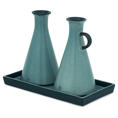 Das 3-teilige Essig Öl Set Manthey 539 von Hedwig Bollhagen vereint Funktion und Eleganz auf charmante Weise. Die rechteckige Platte (HB 537), 19 cm lang und 10 cm breit, bietet eine ideale Bühne für die beiden Flakons (539 und 539-O). Diese handgefertigten Flaschen mit ihrem pyramidenförmigen Korpus sind nicht nur praktische Begleiter für Essig und Öl, sondern auch visuelle Highlights auf jedem gedeckten Tisch. Der Flakon 539 beeindruckt mit puristischer Eleganz, während der Flakon 539-O mit abnehmbarem Naturkorken raffinierte Funktionalität bietet. Beide Flakons fassen 150 ml und sorgen für einen harmonischen, dekorativen Akzent. Ein Set, das Ihr Tischarrangement auf außergewöhnliche Weise verfeinert – ganz im Sinne der meisterhaften deutschen Handwerkskunst, für die Hedwig Bollhagen seit 1934 steht.