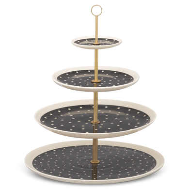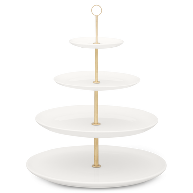 Die vierstöckige Etagere mit der Formnummer “611D” von Hedwig Bollhagen ist die große Schwester der dreistöckigen Version 611C. Formgebend für die beiden Etageren ist das offene Gestell mit verschiedenen, nach unten zunehmend breiter werdenden tellerförmigen Ebenen. Der durchgehende, alle Etagen verbindende Messingstab mit dem kreisrunden Griff an der Spitze rundet das Design elegant ab. Bei einer Höhe von 36 Zentimetern bietet der seit dem Barock so beliebte Tischaufsatz genügend Platz für Obst und Pralinen. Soviel steht fest, ob Erdbeeren, Kirschen oder Konfekt, auf der vierstöckigen Etagere von Hedwig Bollhagen lassen sich Früchte und Gebäck jeder Art stilvoll kredenzen.