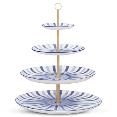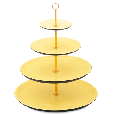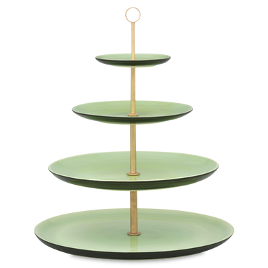 Die vierstöckige Etagere mit der Formnummer “611D” von Hedwig Bollhagen ist die große Schwester der dreistöckigen Version 611C. Formgebend für die beiden Etageren ist das offene Gestell mit verschiedenen, nach unten zunehmend breiter werdenden tellerförmigen Ebenen. Der durchgehende, alle Etagen verbindende Messingstab mit dem kreisrunden Griff an der Spitze rundet das Design elegant ab. Bei einer Höhe von 36 Zentimetern bietet der seit dem Barock so beliebte Tischaufsatz genügend Platz für Obst und Pralinen. Soviel steht fest, ob Erdbeeren, Kirschen oder Konfekt, auf der vierstöckigen Etagere von Hedwig Bollhagen lassen sich Früchte und Gebäck jeder Art stilvoll kredenzen.