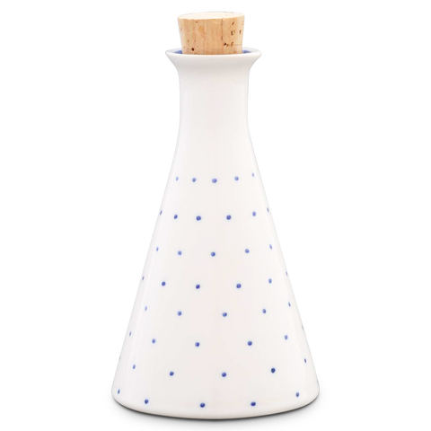 Der Flakon von Hedwig Bollhagen mit der Formnummer "539E" überzeugt durch ein schlichtes, modernes Design mit vielseitigen praktischen Attributen. Mit einer Höhe von 13 Zentimetern und einer Breite von 8 Zentimetern bietet sich das handgemachte Keramik-Gefäß mit abnehmbarem Naturkorken hervorragend als elegante Essig- und Ölflasche an, setzt aber auch für diverse andere Einsätze stets gelungene Akzente. Charakteristisch ist der pyramidenförmig nach oben wachsende Korpus mit einem Fassungsvermögen von 150 ml, der sich zu einem schmalen Hals verengt und mit einem nach außen fließenden Rand abschließt. Der 160 Gramm leichte Flakon 539E mit Naturkorken ist ein handgemachtes Unikat, das mit seinen harmonischen Konturen jedes Tischdekor auf stilvolle Weise veredelt.