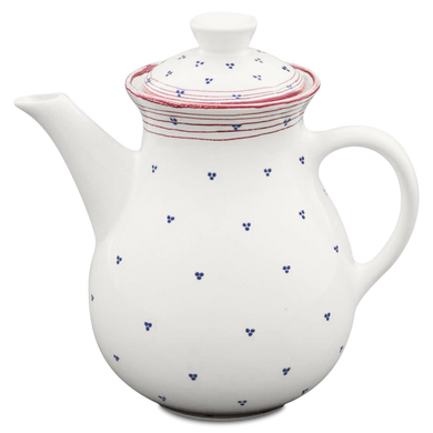 Die Kaffeekanne mit der Formnummer „1065A" von Hedwig Bollhagen garantiert höchsten Genuss diverser Heißgetränke mit einer Extraportion Nostalgie-Ästhetik. Die 15 Zentimeter hohe und 10 Zentimeter breite Kaffeekanne besitzt ideale Abmessungen, um zum Blickpunkt jeder Kaffeetafel zu avancieren, ohne viel Raum wegzunehmen. Die klassisch bauchige Gestalt der Kaffeekanne aus handgemachtem Keramik konturiert sich als harmonisch geschwungene Birnenform und weist ein Fassungsvermögen von 600 ml auf. Der rund geschwungene Kannenhenkel rückt in charakterstarken Kontrakt zum kantig geformten Knauf des Kannendeckels. Die nur 350 Gramm leichte Kaffeekanne der Serie HB-Ritz ist ein edles Serviergefäß, das zu jeder Gelegenheit passende Akzente setzt.