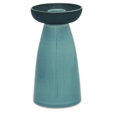 Der Leuchter von Hedwig Bollhagen mit der Formnummer "216" bringt das Wohnambiente zum Strahlen und perfektioniert die Tischhdekoration durch zeitlose Erlesenheit. Typisch für den 350 Gramm leichten Keramikleuchter ist ein sich vom standfesten, breiten Boden konisch verjüngender Korpus, der sich nach oben hin wiederum zu einem Kerzenhalter in charaktervoller Schalenform erweitert. Mit einem Durchmesser von 8 Zentimetern ist der 15 Zentimeter hohe Kerzenleuchter beinahe doppelt so hoch wie breit und setzt mit seinen harmonischen Proportionen stets gelungene Highlights. Der handgemachte Leuchter 216 ist ein Qualitätsprodukt der Keramikwerkstätten in Marwitz, das sich äußerst geschmackvoll in vielfältige Dekokulissen einfügt.