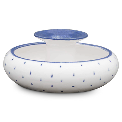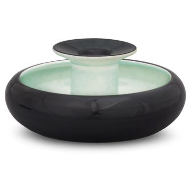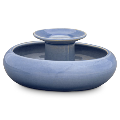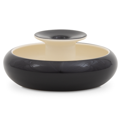 Der Leuchter von Hedwig Bollhagen mit der Formnummer „215“ erinnert an eine Mischung aus fliegender Untertasse und umgedrehtem Pilz. Charakteristisch ist der rundlich-konvexe Korpus mit dem zylinderförmigen, kaminartigen Leuchter in der Mitte, der sich nach oben kegelförmig zum Kerzenhalter auffächert. Mit einem Durchmesser von 14 Zentimetern ist der sechs Zentimeter hohe Leuchter mehr als doppelt so breit wie hoch. Bei einem Gewicht von 750 Gramm gehört dieser Leuchter nicht nur zu den Schwergewichten im Sortiment, sondern steht auch sicher und stabil. Und falls beim Windstoß doch mal Wachs herunter tropft, verhindert der integrierte Unterteller lästige Flecken. Schön ist eben, was funktioniert.
