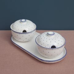 Fayence weiß mit blauen Punkten und Abschluß Glasur glänzend