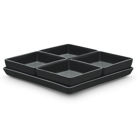 Das 5-teilige Schälchen-Set HB 554 von Hedwig Bollhagen bringt klare Formen und vielseitige Einsatzmöglichkeiten in perfekten Einklang. Die quadratische Servierplatte (HB 553) mit ihren großzügigen 24 Zentimetern bildet das Herzstück dieses Sets und eignet sich ideal für vielfältige Speisenarrangements und das stilvolle Anrichten ob Tapas, Käseplatten oder Desserts. Begleitet wird die Platte von vier ebenfalls quadratischen Schälchen (HB 554) mit 11,5 Zentimeter Seitenlänge, die flexibel für Beilagen, Dips, Obst oder andere Kleinigkeiten genutzt werden können und sich nahtlos in jede Tischdekoration einfügen. Die minimalistische Eleganz der "Kabarett-Serie" macht dieses Set zu einem stilvollen Blickfang, der sowohl im Alltag als auch bei besonderen Anlässen überzeugt. Handgefertigt in den Marwitzer Werkstätten in Deutschland, verkörpert dieses Set für die exklusive Handwerkskunst, für die Hedwig Bollhagen seit 1934 bekannt ist.