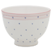 Fayence weiss mit blauen Punkten und rosa Rand Glasur glänzend