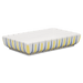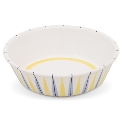 Fayence weiß gelbe Bänder und blaue Striche Glasur glänzend