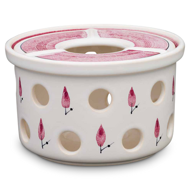 Das zweiteilige Stövchen von Hedwig Bollhagen mit der Formnummer „535“ verströmt ein behagliches Wohlfühl-Ambiente. Charakteristisch sind die geradlinige, zylindrische Form des Korpus und der oben aufliegende, flache Untersetzer mit der runden Teelicht-Öffnung in der Mitte. Und Dank der zahlreichen, etwa einen Zentimeter kleinen Luftlöcher geht bei der dezenten Beleuchtung ganz sicher mehr als ein Licht auf. Die 350 Gramm leichte und siebeneinhalb Zentimeter niedrige Feuerstelle ist mit einem Durchmesser von zwölf Zentimetern mehr breit als hoch. Ob die Terrine mit der klaren Brühe, der Guten-Morgen-Kaffee auf dem Frühstückstisch oder die Teekanne auf dem Schreibtisch, mit den keramischen Stövchen von Hedwig Bollhagen gehören die kalten Suppen und Heißgetränke endlich der Vergangenheit an.