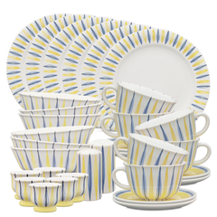 Fayence weiß gelbe Bänder und blaue Striche Glasur glänzend