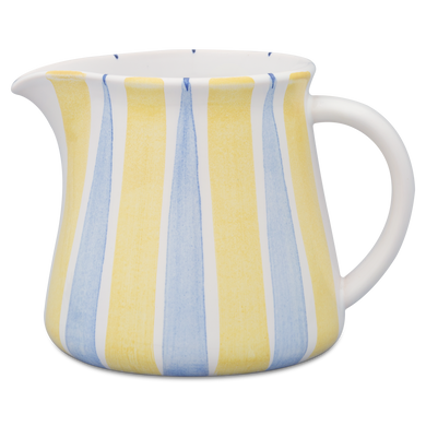 Fayence weiß blaue Keile und gelbe Bänder Glasur glänzend