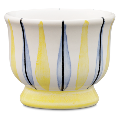 Fayence weiß gelbe Bänder und blaue Striche Glasur glänzend