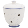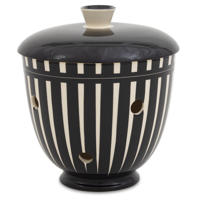 Der Zwiebeltopf mit der Formnummer “549ES” von Hedwig Bollhagen ist die große Schwester der kleineren Version 549DS. Bei einer Höhe von 18 Zentimetern und einer Breite von 19,5 Zentimetern ist der Zwiebeltopf 549ES fast so hoch wie breit. Charakteristisch ist der kugelförmig-gebauchte, nach oben sich konisch öffnende Korpus. Der kegelförmige Griff auf dem bauchig nach oben gewölbten Deckel rundet das Design elegant ab. Dank der zahlreichen, verteilten und je etwa einen Zentimeter großen Löcher in der Gefäßwand kann die Luft gut zirkulieren. Das zweiteilige Set aus Gefäß und Deckel bietet Schalotten, Zwiebeln und Knoblauch nicht nur einen nachhaltigen und stilsicheren Aufbewahrungsort sondern im dunklen Inneren bleibt das Lauchgewächs auch lange frisch und schmackhaft.